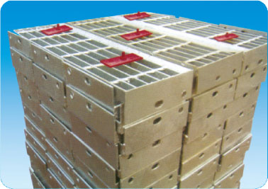 采用摞疊式,上部和底部各有四支鋼件,中間用四條MB或M10的長螺桿穿格柵孔洞而緊固,適用于叉車和繩.吊的裝卸。扁鋼厚度為3mm的鋼格板,在底部墊有四塊角鐵,以保護(hù)裝卸時(shí)不產(chǎn)生變形。